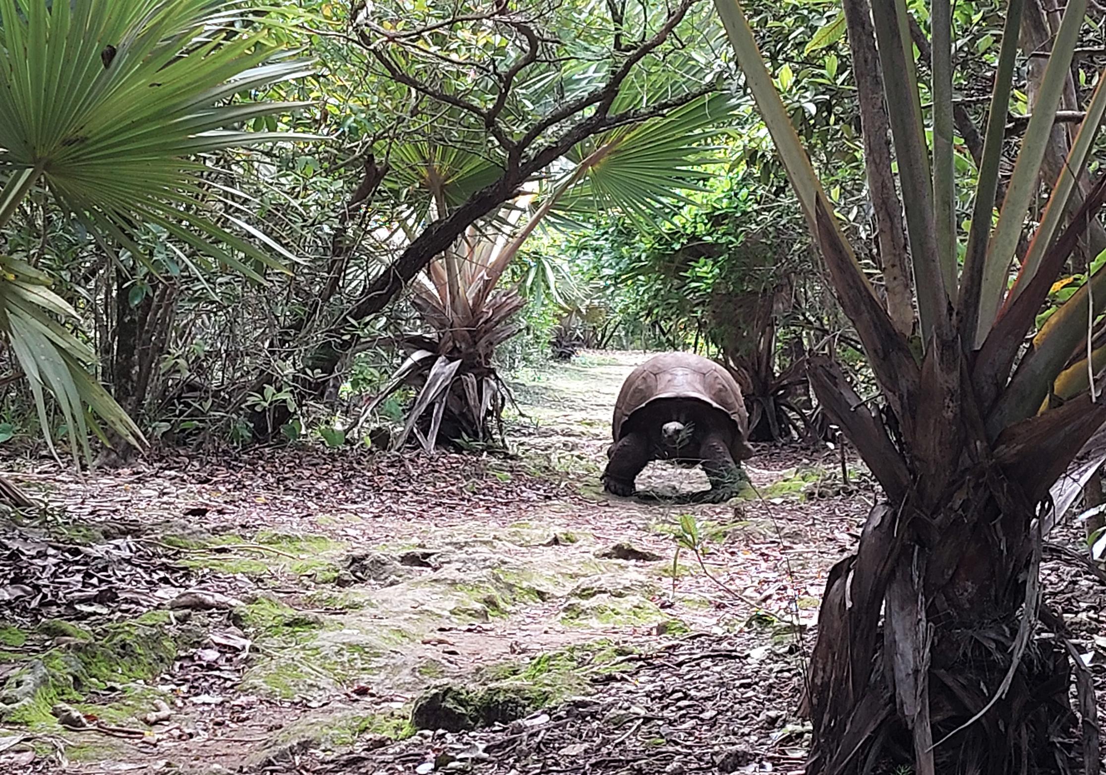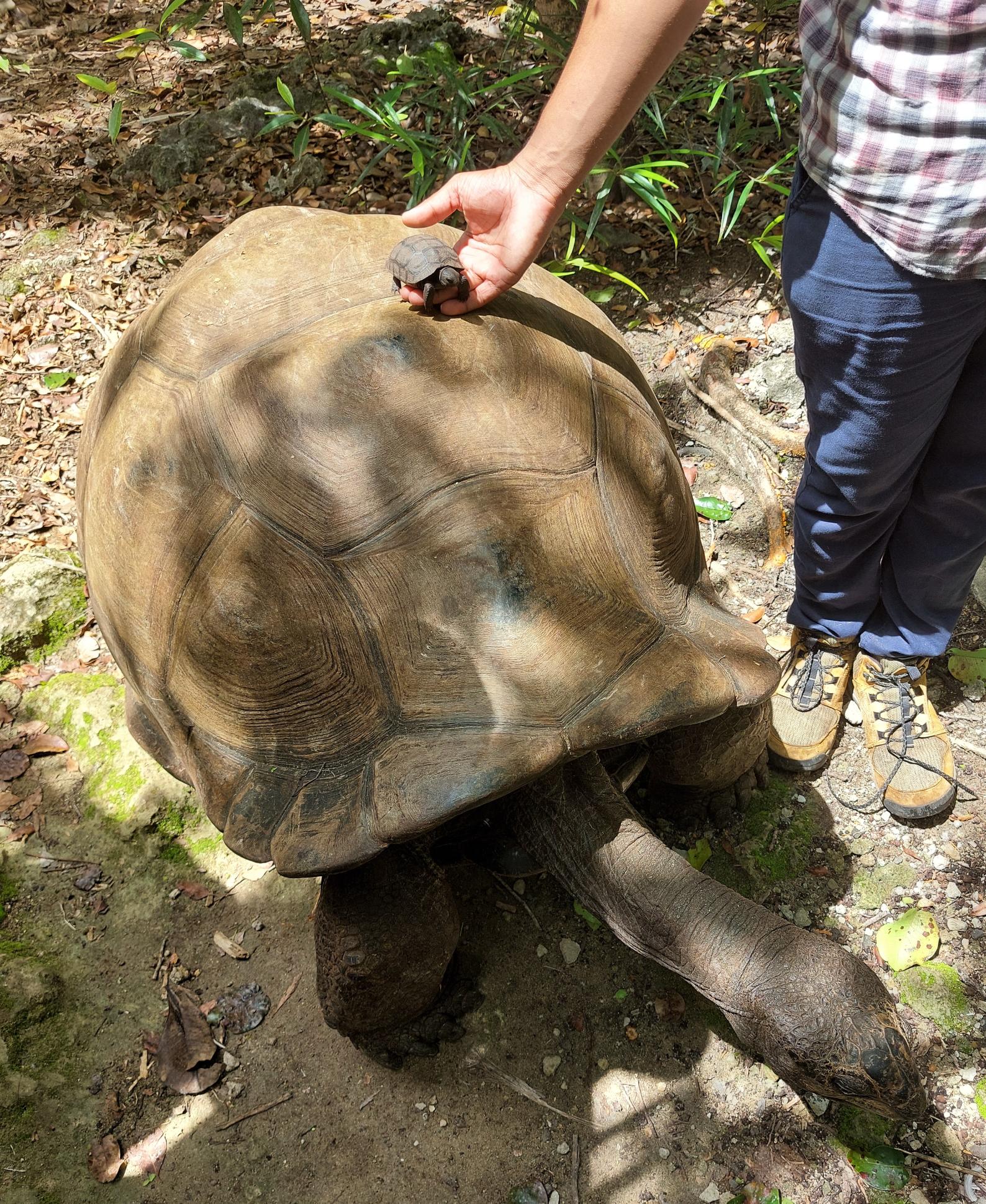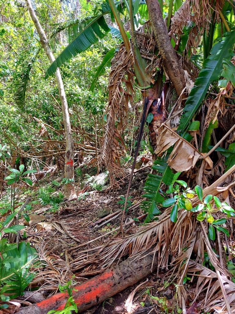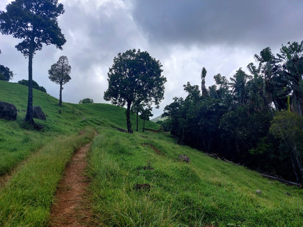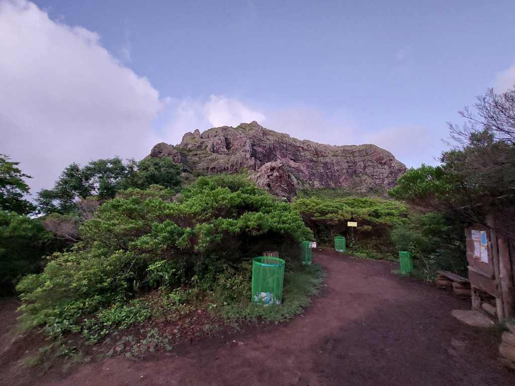 In aller Frühe (man könnte es auch mitten in der Nacht nennen) sammelt er mich vor der Unterkunft ein. Wir (es ist noch ein französisches Mädel dabei) fahren die wenigen Kilometer zum Parkplatz in Le Morne. Als wir um 5:30 Uhr Richtung Berg loslaufen, ist es noch immer stockdunkel. Wir folgen dem spärlichen Schein von Ben’s Handytaschenlampe und meiner Minifunzel, die ich schnell anschalte, nachdem es das zweite Mal unter meinem Fuß fieß geknackt hat. Als ich auf den Boden leuchte, erklärt sich meine Trefferquote. Große muschelartige Schnecken bevölkern den feuchten Boden.