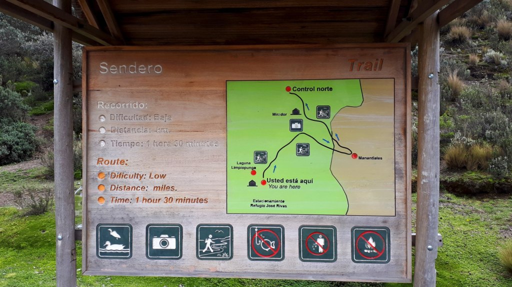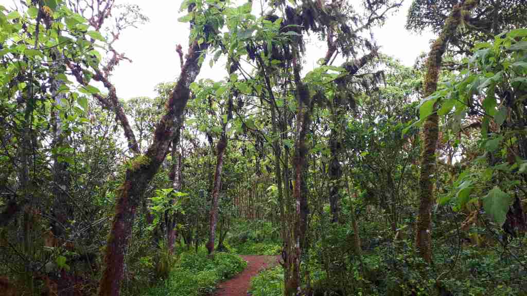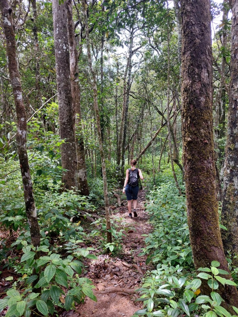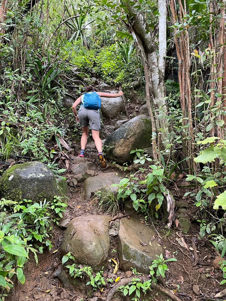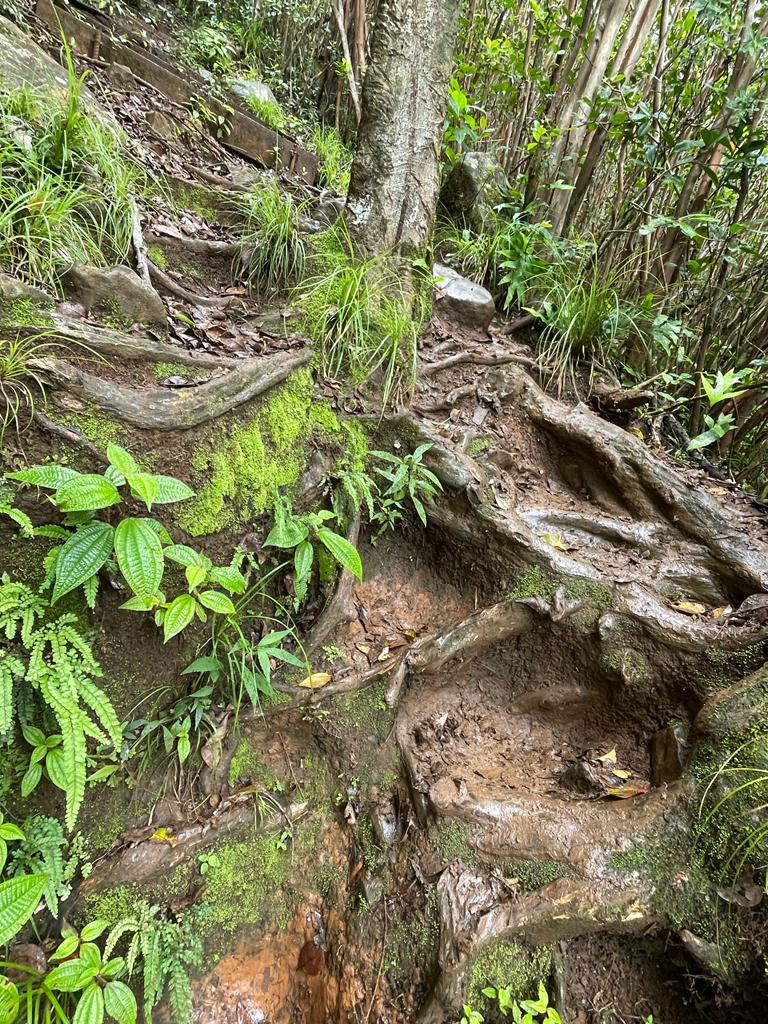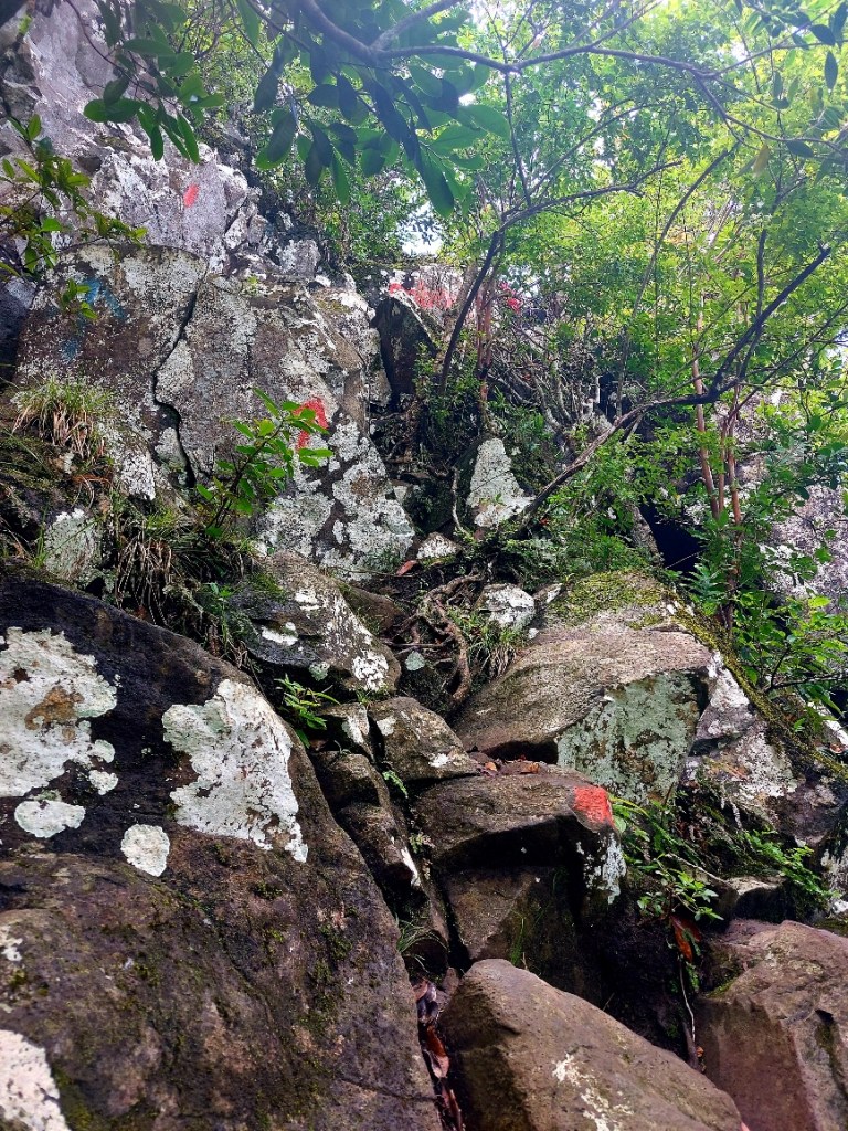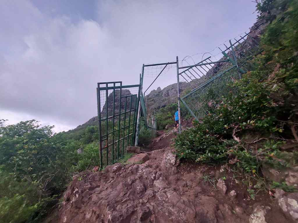 Auf dem Zwischenplateau erreichen wir das Warnschild. Ab hier gefährliches Klettern! Und Erklärungen, was alles zu befolgen ist. Der Trümmer von Berg thront vor uns, zum Greifen nahe. Die Fingerchen kribbeln schon! Ben kündigt an, wir würden nun etwas langsamer laufen. Aha. Wir merken davon irgendwie nichts. Nachdem wir ein Tor passiert haben, heißt es Hand anlegen für die Kletterpassagen. Kilometermäßig weit ist der gesamte Weg nach oben nicht, doch insbesondere die leichten Klettereien sind teils sehr steil und abschüssig. Wir steigen durch eine eine Rinne aufwärts, in der Wasser runterläuft. Ben lotst uns dran vorbei, besser durch matschige Passagen, statt über rutschig-nassen Felsen. Hier bieten zumindest Bäume etwas Halt. Der folgende Anstieg ist das schwerste Stück. „Good exercise,“ lächelt unser Bergführer.