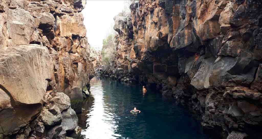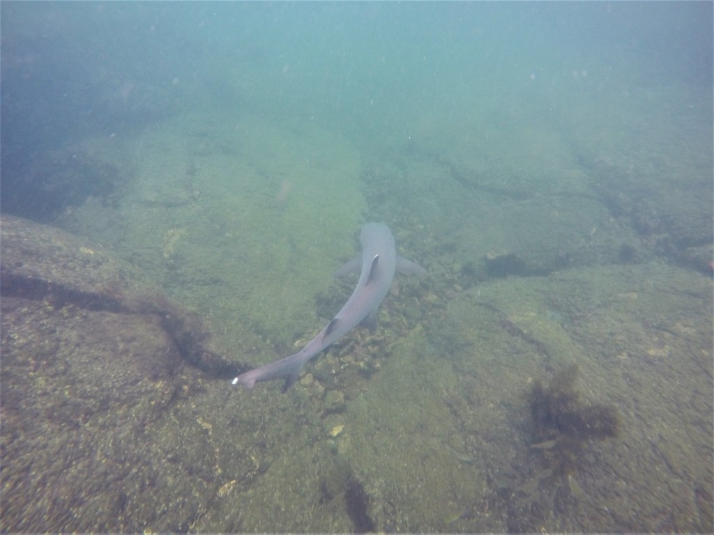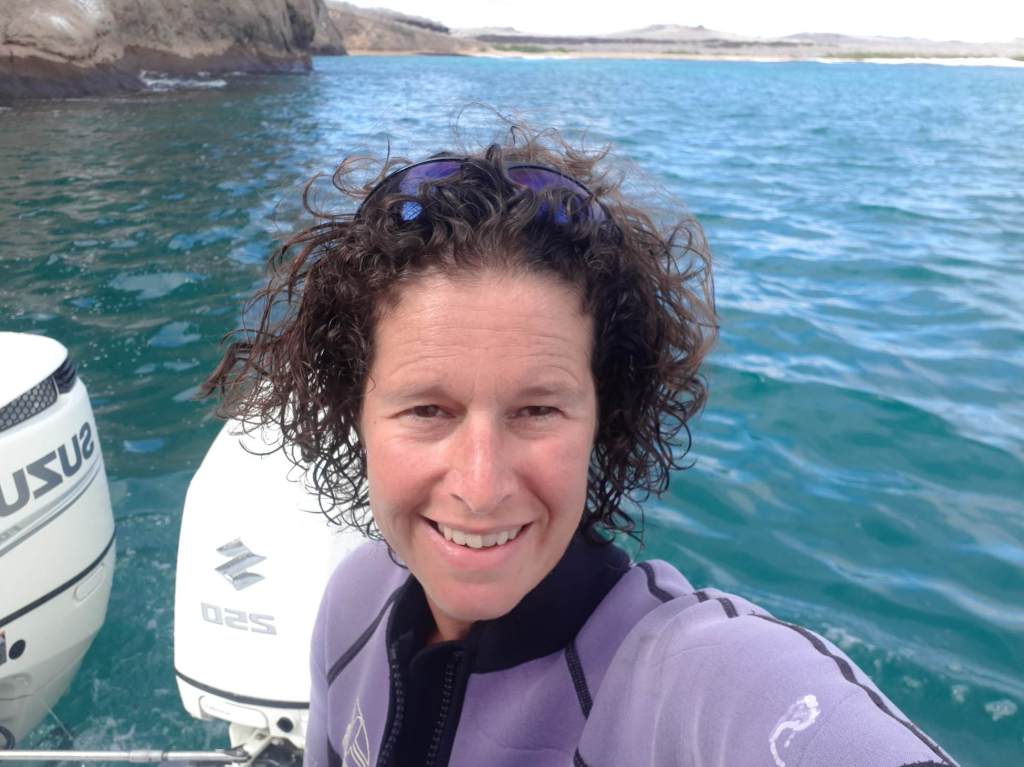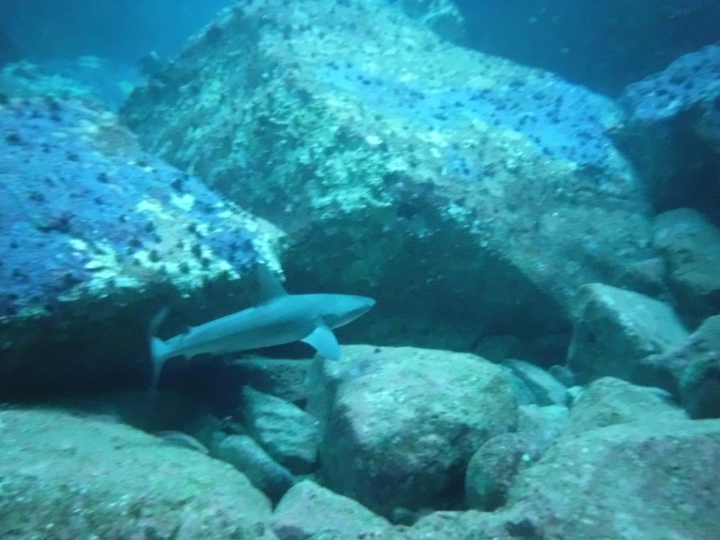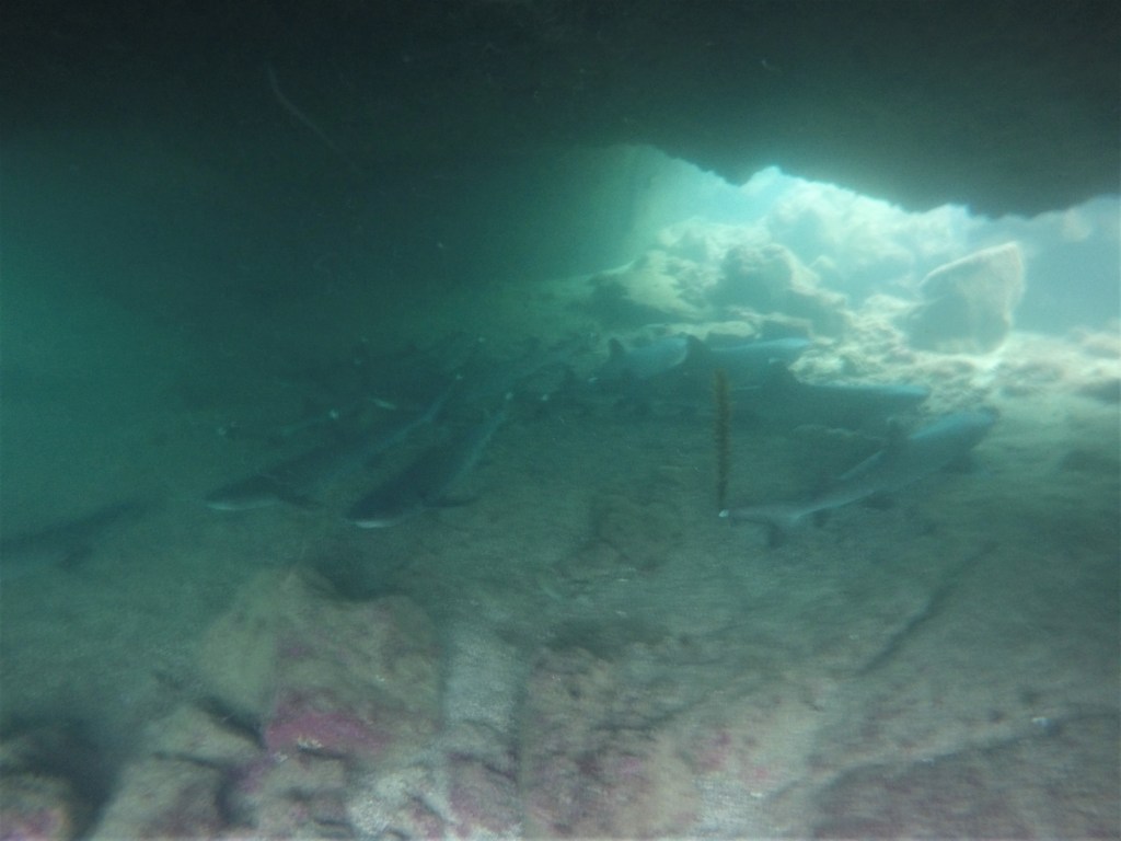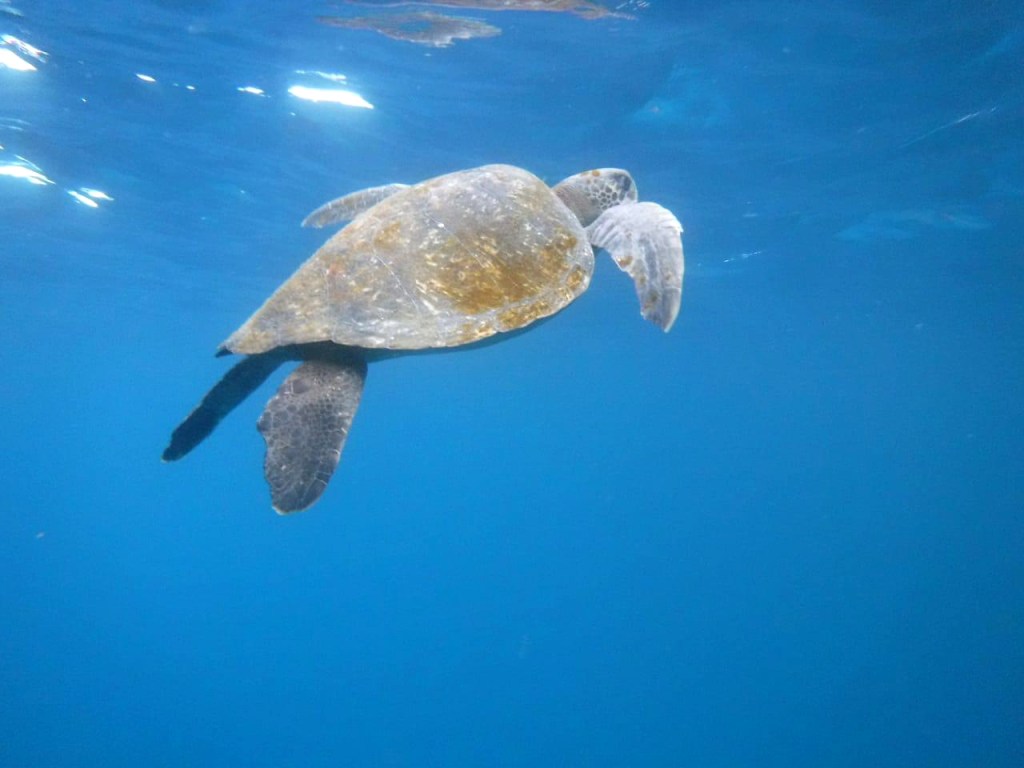 Ich bin selbst völlig verblüfft, dass es mich keinerlei Überwindung kostet, in den dunklen, unbekannten Abgrund unter mir zu springen. Scheinbar wurde der Kopf zusammen mit dem Magen von den Tabletten ins Off geschossen. Oder er ist zu dieser Uhrzeit noch gar nicht angeschaltet. Umso besser. Wenn ich mich an die letzte Aktion auf Galapagos erinnere (da waren allerdings Haie drunter), fand ich das recht bedrohlich und haderte sehr (den Bericht findet man hier zum Nachlesen). Jetzt kann ich es kaum erwarten, mich im Ozean zu versenken. Das Wasser ist selbst hier draußen unfassbar warm! Um das Boot zischten gerade etliche Delfine, hoffentlich sind sie noch da. Es dauert einen Moment, bis sich die Augen an das tiefe Blau gewöhnt haben, das alles rundum zu verschlucken scheint. In meine Ohren dringen diese typisch pfeifenden Delfingeräusche und dann nehme ich Bewegungen unter mir wahr. Vor unbändiger Freude quietsche ich in meine Maske. Der Kopf kapiert gar nicht die unwirkliche Situation. Schnorcheln mit Delfinen, mitten im Nirgendwo! Euphorisch tauche ich auf und suche Janine. Sie klammert sich an der Leiter des Bootes fest und scheint in Panik zu sein. Sie hat unter ihrer Schnorchelmaske keine Luft mehr bekommen. Navin zieht sie am Handgelenk ins Boot hinein. Auch wir schwimmen zurück und steigen wieder ein.