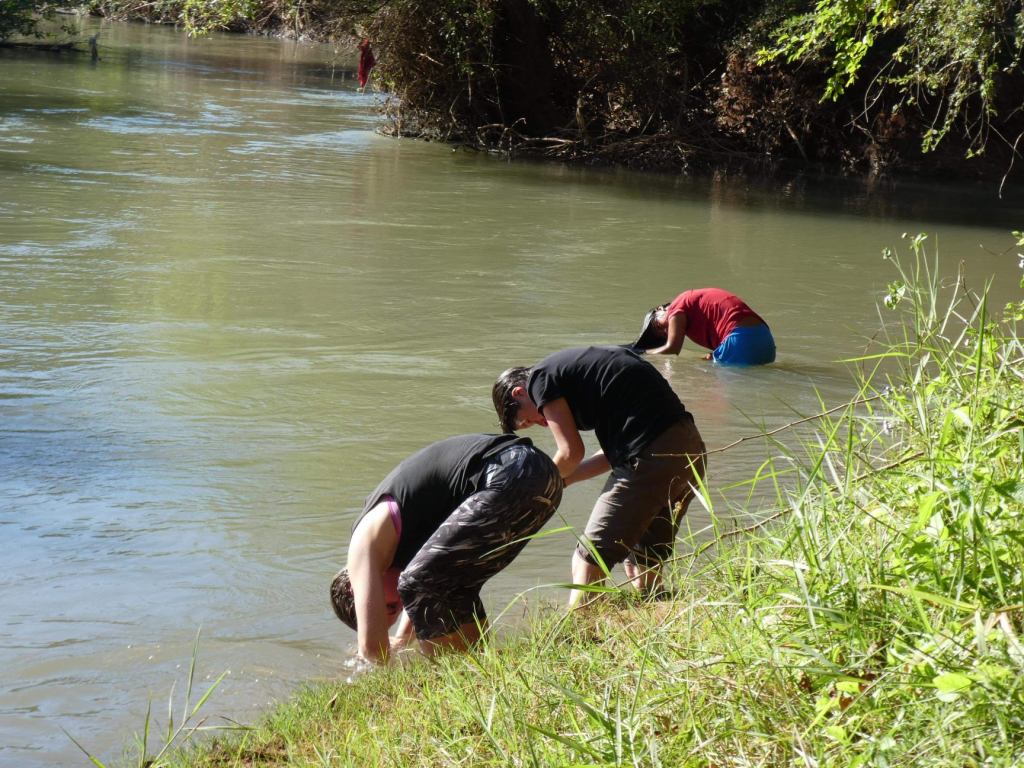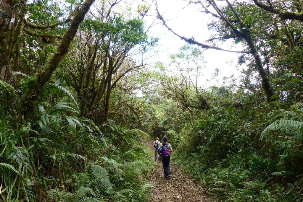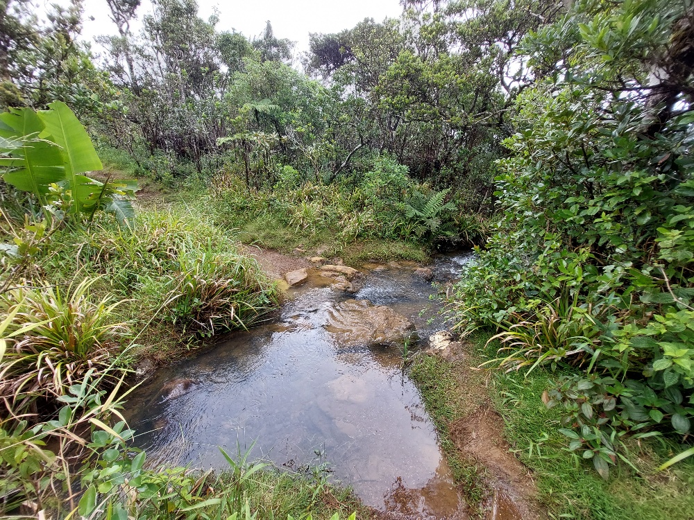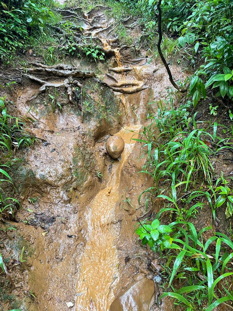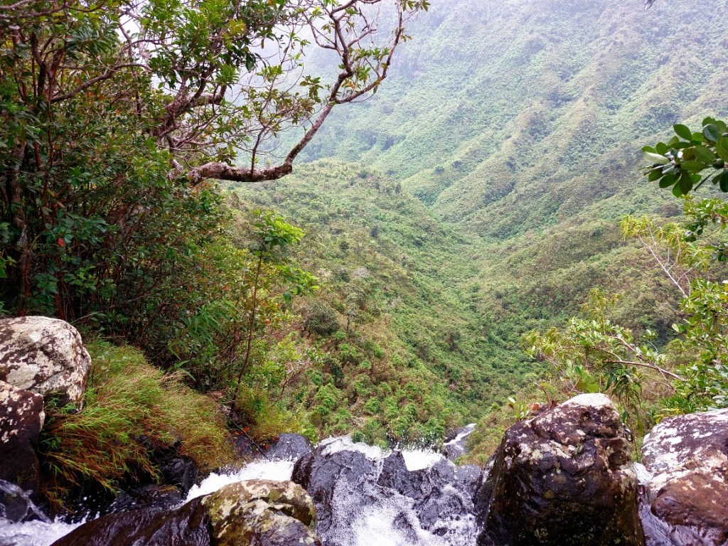Der Weg führt auf der gegenüberliegenden Seite weiter. Also Treter aus und das Flußbett oberhalb durchqueren. Wir folgen dem Pfad einige Meter und steigen eine wurzelige Matschrinne zum Wasserfall hinab. Erneut müssen wir die Schuhe ausziehen, um die Seite zu wechseln. Es geht nur ein kurzes Stück weiter durch die Schlucht, dann beginnt an einem zweiten, kleineren Wasserfall das Spiel ein drittes Mal. Latschen aus, Seitenwechsel, Füße trocknen, Schuhe an. Nach wenigen hundert Metern stehen wir abermals vor einem knietiefen Flusslauf, den es zu überqueren gilt. Hmpf, wir sind mehr mit an- und ausziehen von Schuhen und Strümpfen beschäftigt, als wir vorankommen. Wenn das so weiter geht, fallen die Mauken bald ab. Barfuß wollen wir auf dem teils stark zugewucherten, kaum erkennbaren Boden allerdings nicht laufen. Hoffentlich müssen wir nicht den gleichen Weg zurück.