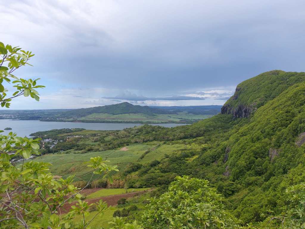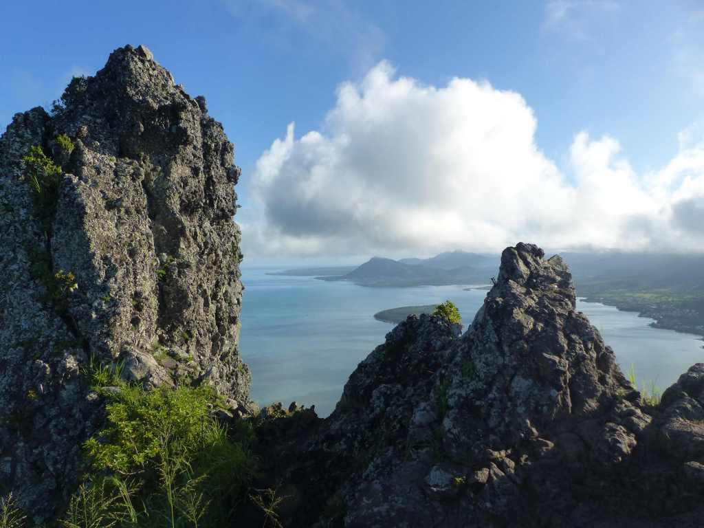 Während Ben höher auf die schmale Felsnadel nebenan klettert, machen wir Mädels Fotos als gäbe es kein Morgen mehr. Wir verbringen ausgiebig Zeit auf dem Gipfel, Ben weiß unheimlich viel über die Umgebung, erklärt uns die Farbzusammenhänge im Meer mit den Korallen und die umliegenden Inseln. Selbst La Réunion ist an guten Tagen von hier zu sehen. Sogar den Crystal Rock, die schwimmende Weihnachtskoralle, entdecken wir. Genauso die Boote an den Delfin Hotspots draußen. Der ausragende Viewpoint mit dem Felsen bei Bel Hombre, Chamarel mit den Wäldern, die ganzen Strände, alles breitet sich vor unseren Augen aus. Allein das Farbenspiel am Himmel, die große Wolke, die auf uns zusteuert und sich genauso schnell hinter uns wieder in Nichts auflöst und puren Sonnenschein zurücklässt, traumhaft. Weitere Gipfelstürmer kommen an. Einer davon ist ein Bekannter von Ben, dessen Rekord bei 17 Besteigungen des Le Morne Brabant HINTEREINANDER liegt! Es gibt schon krasse Leute…