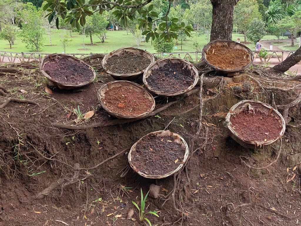 Am ersten Aussichtspunkt erwacht der Himmel leise und gewährt uns einen friedvollen Blick über die Weiten des Meeres. Ben drängt weiter. Über einen breiten Weg stapfen wir bergauf, während unser einheimischer Guide eine Beere vom Baum pflückt und mich fragt, ob ich „Glue“ kenne. Noch während ich den Kopf schüttel, habe ich eine schleimige Pampe auf dem Finger. „Das wird als Kleber benutzt“, amüsiert sich Ben, während ich irritiert meine zusammengeklebten Finger betrachte. Schon hat er die nächste Pflanze am Start. Ben rupft Blätter ab, zerreibt sie und hält sie uns unter die Nase. Ein wunderbares Pfefferaroma bahnt sich seinen Weg über meine Geruchsrezeptoren. Überall um uns herum wächst roter Pfeffer, der hier richtig gut und richtig teuer ist.