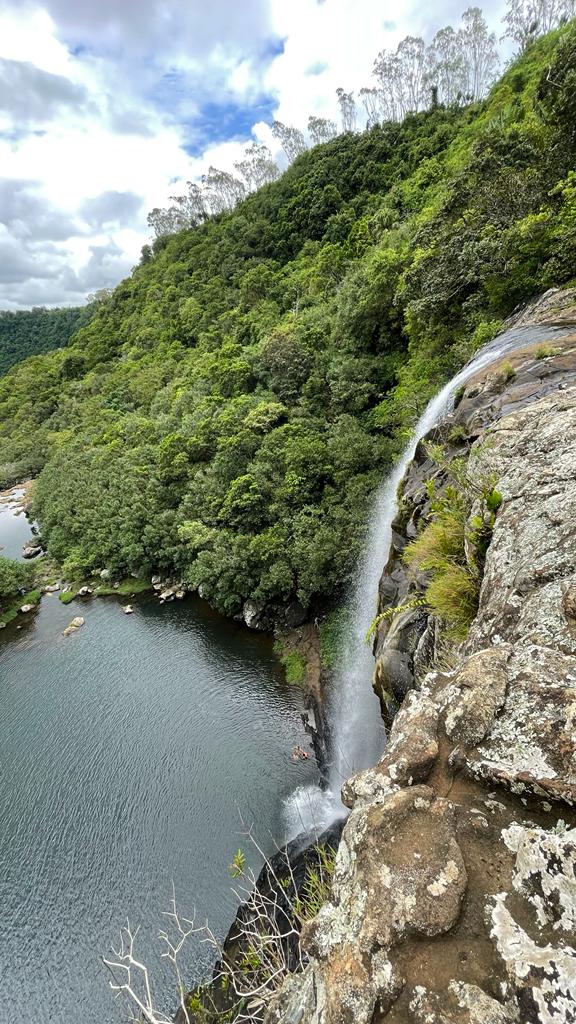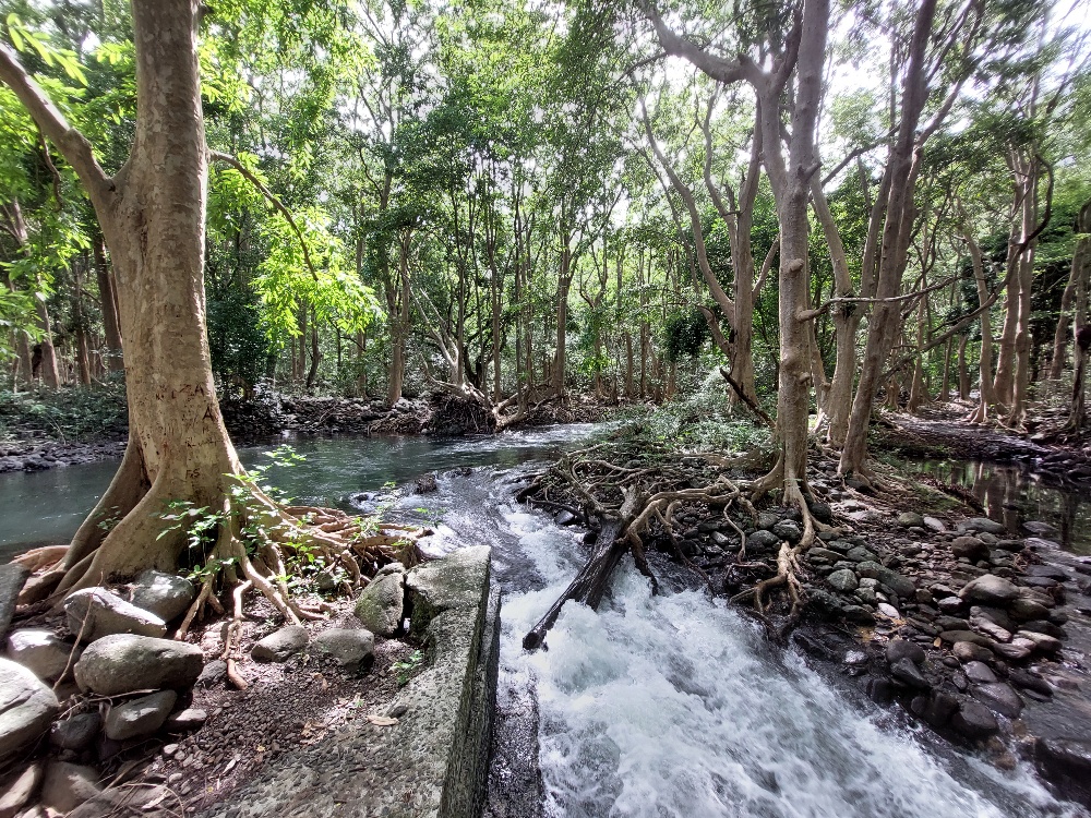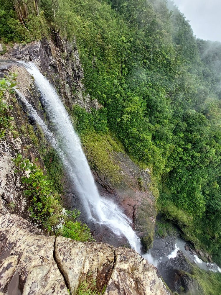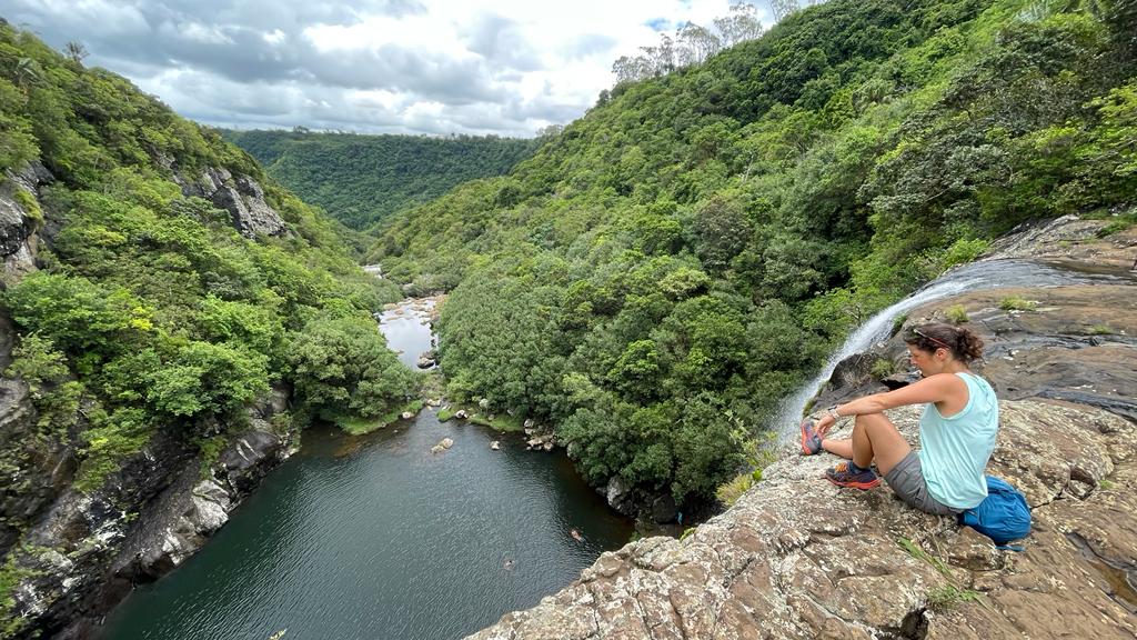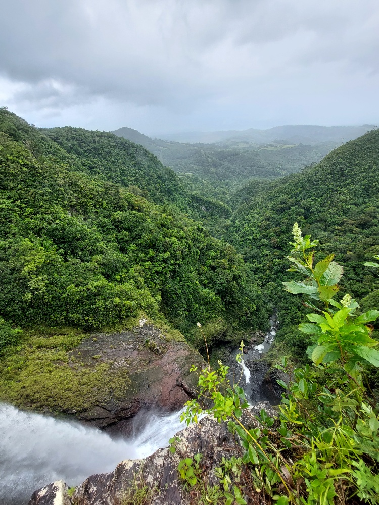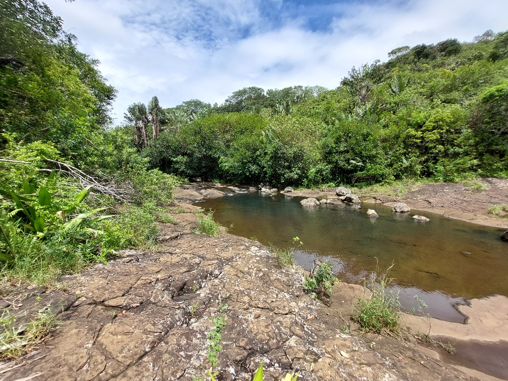 Da wir von unserer überaus inselkundigen Bekanntschaft (dem Einheimischen, den wir vor Tagen am Strand kennenlernten) über einen versteckten Wasserfall in der Nähe des Roche qui pleure informiert wurden, verfügen wir über heiß begehrtes Insiderwissen für Nicht-Touristen. Guter Draht zu den Locals zahlt sich aus. Die Wegbeschreibung hat er uns erklärend in den Sand gemalt und wir (mehr oder weniger) in einer nicht Rum-geschädigten Hirnwindung abgespeichert. Der Wasserfall liegt auf unserem Weg, den lassen wir uns natürlich nicht entgehen und können ihn mit einer kleinen Wanderung verbinden. Über die Richtung philosophierend, stiefeln wir zu den erwähnten Zuckerrohrfeldern und hören nach einer Weile tatsächlich im Wald ein Rauschen. Wir haben ihn gefunden! Ein toller Wasserfall mit Dschungelatmosphäre, ganz für uns allein.